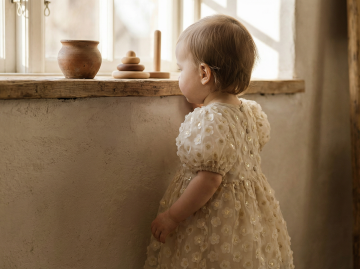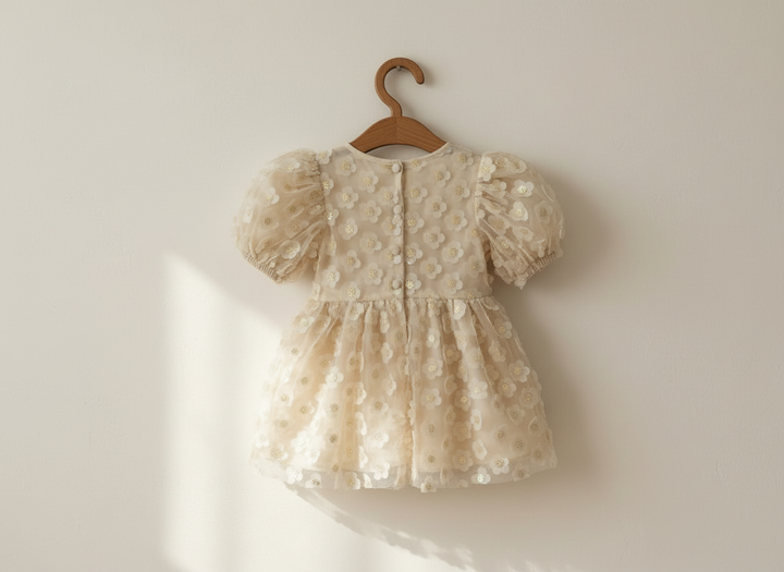 Celebration ballerina dress with applications and glitters. Button on the back.