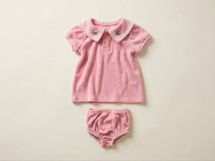 Cotton set of t-shirt with marine style embroidered neck and embroidered panty.
