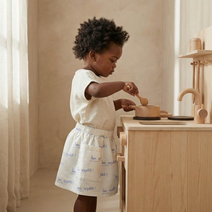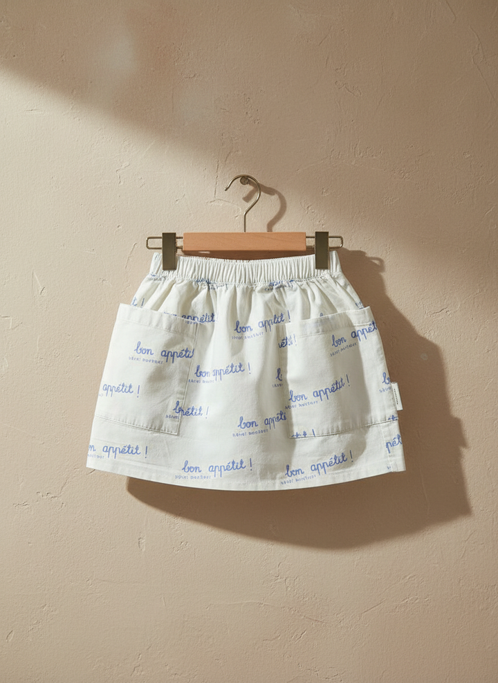 Cotton skirt with "Bon appetit" writing. Short to middle length.